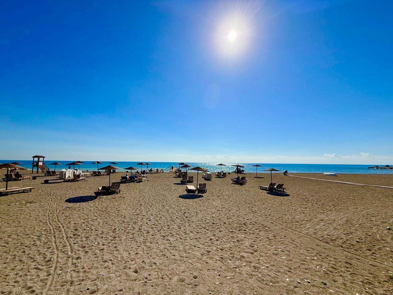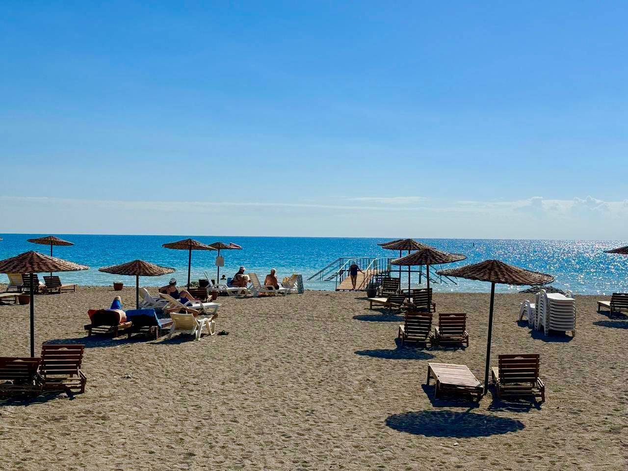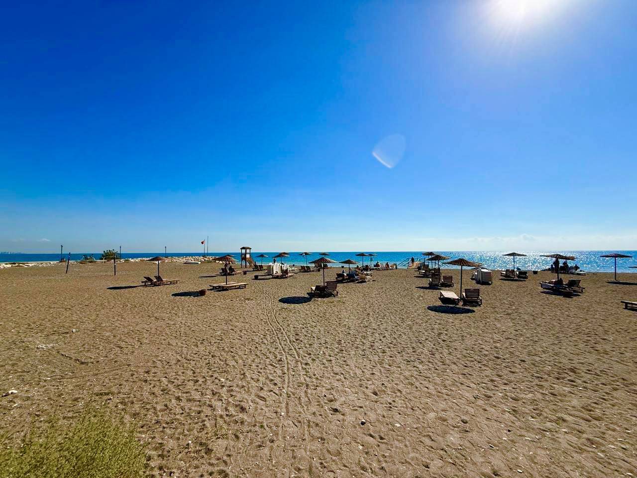 - Strand mit Sonnenlieger, Regenschirmen, Pier, Dusche