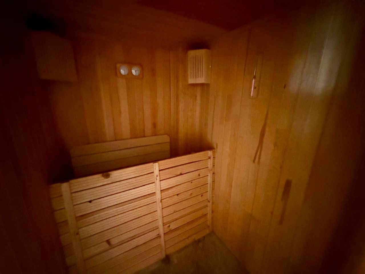 3 Schlafzimmer, 3 Badezimmer, Flur, Wohnzimmer, Küche, verglaste Terrasse, Balkon, Abstellraum, Sauna.