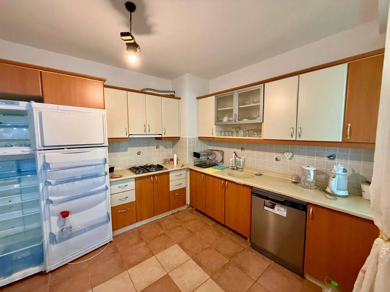 - Im Küchenbereich: Kühlschrank, Geschirrspüler, Herd, Dunstabzugshaube, Wasserkocher, Insel = Esstisch, Stühle