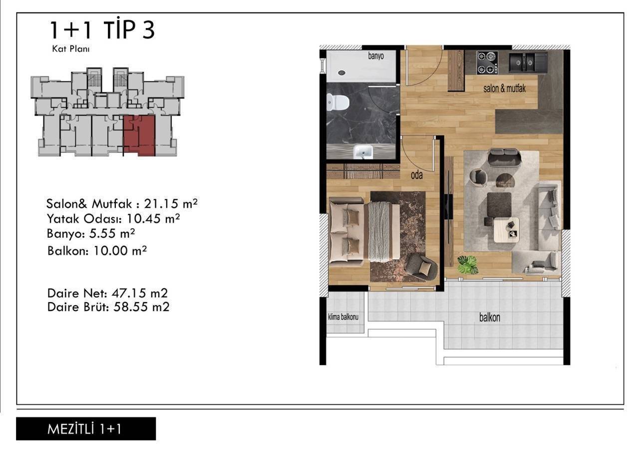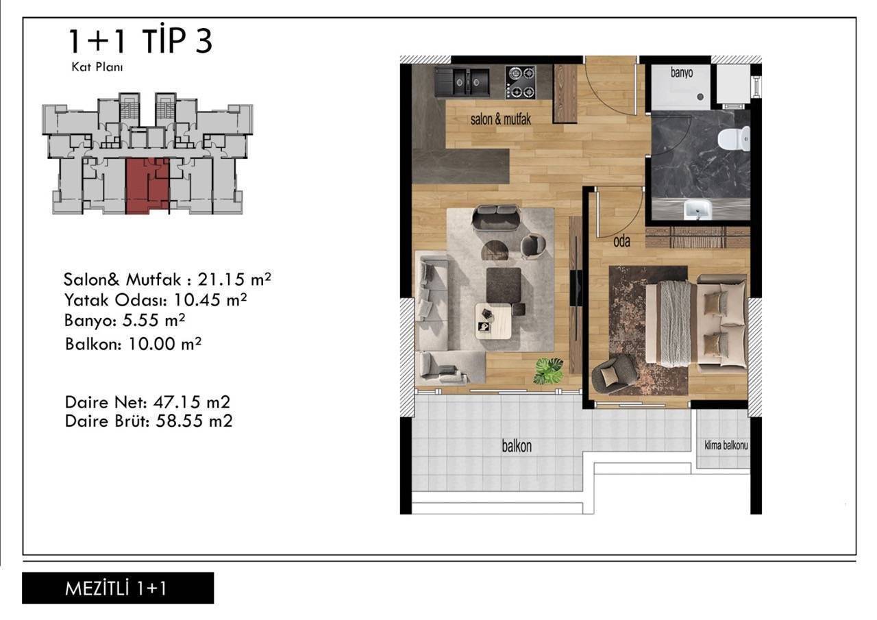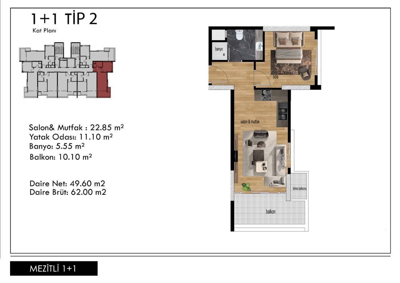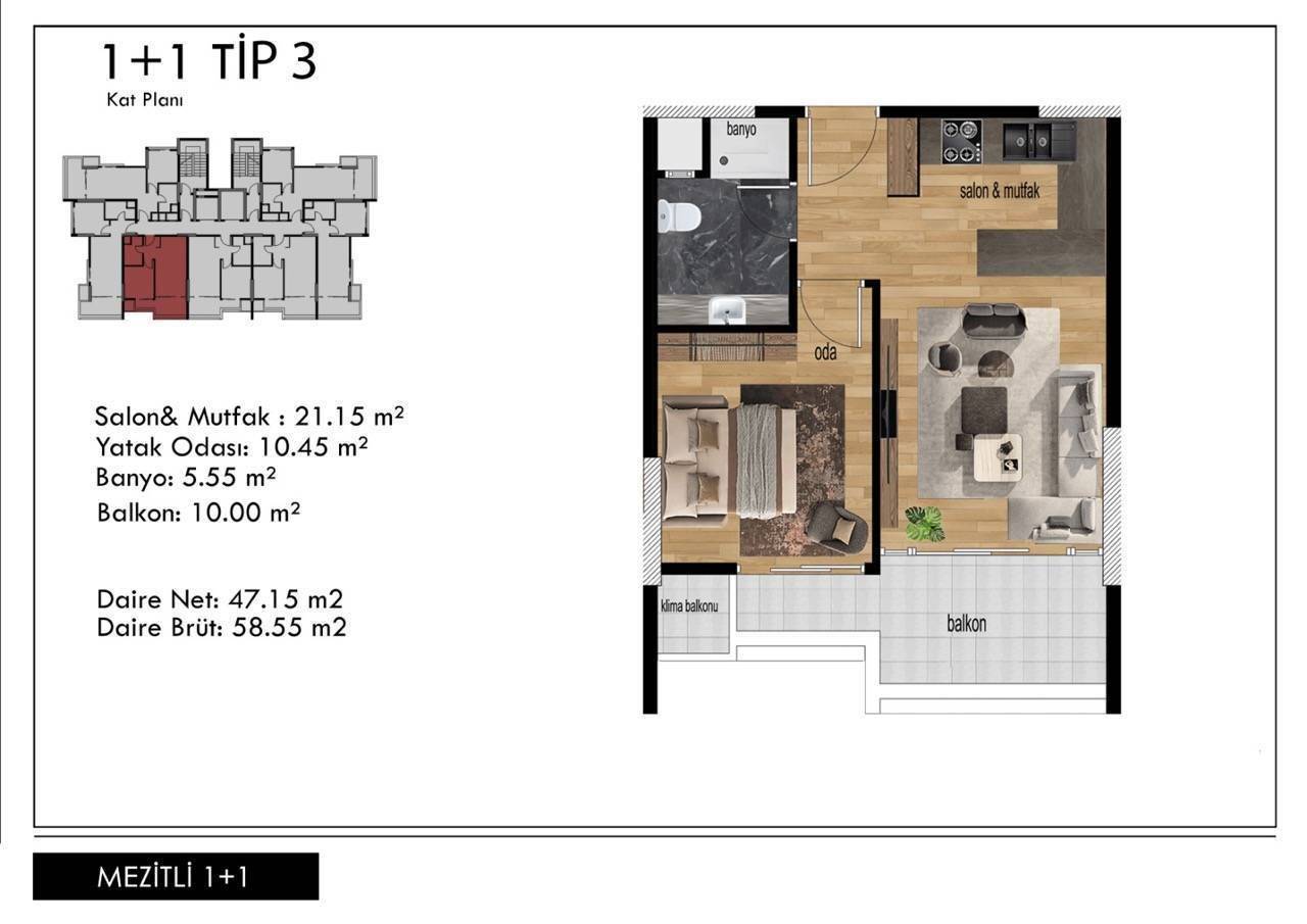 Area 1+1 - 58 m2 gross, 44 m2 net