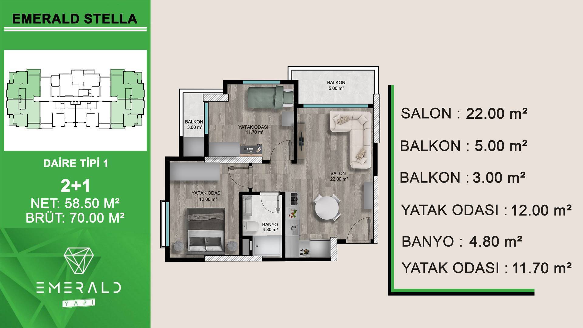 Apartments 2 + 1, area 70 m2 gross / 58.5 m2 net