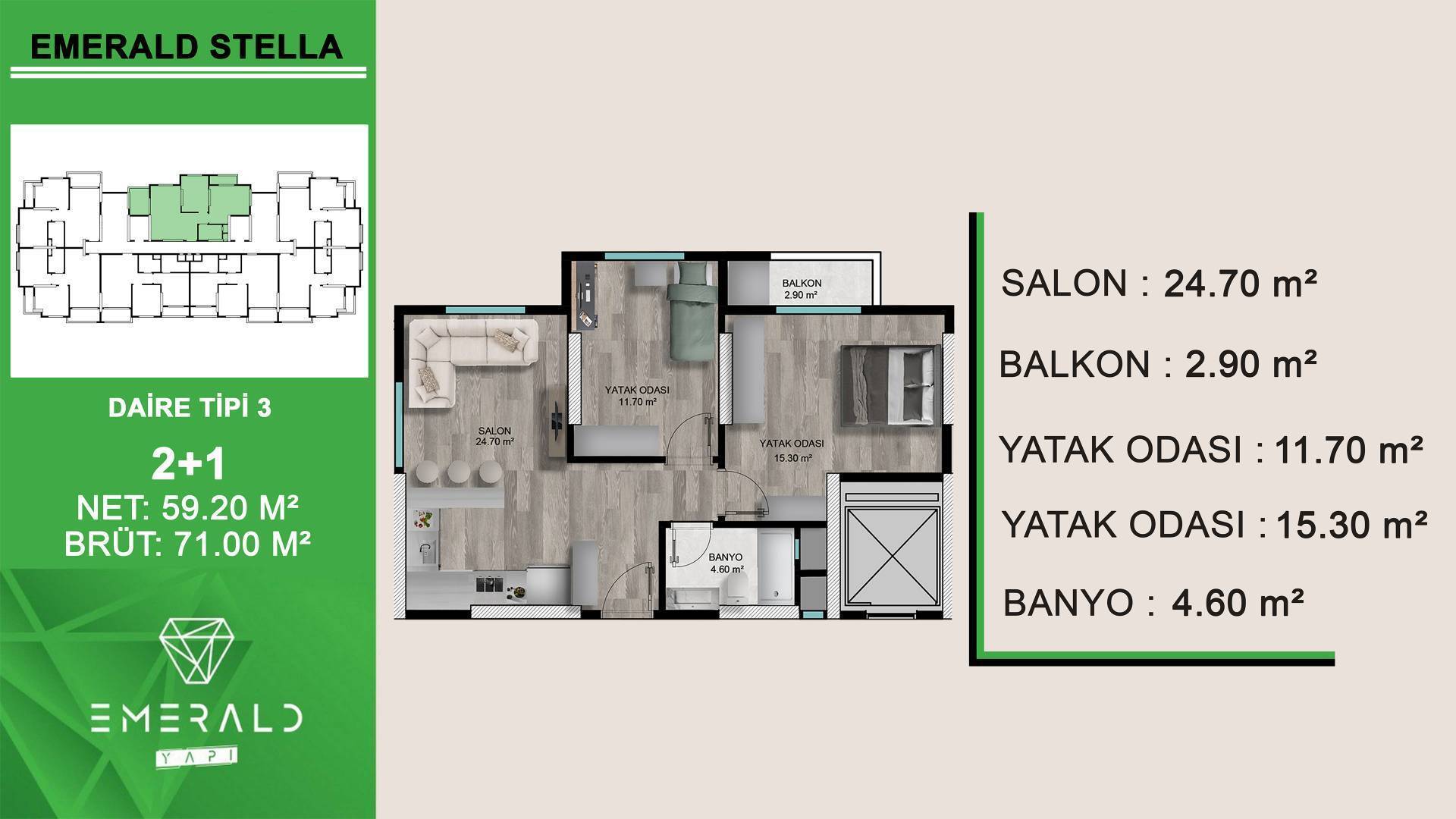 Apartments 2 + 1, area 71 m2 gross / 59.2 m2 net