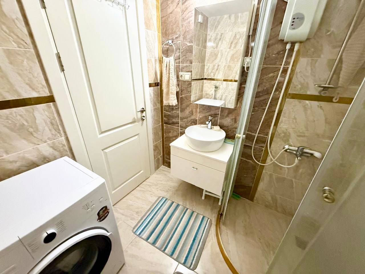 - В спальне: двуспальная кровать, 2 тумбочки, пуфик, шкаф