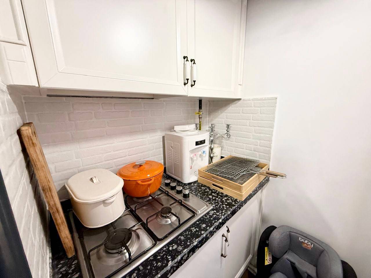- В салоне: остров, обеденный стол, стулья, телевизор, плита, духовка, вытяжка, холодильник